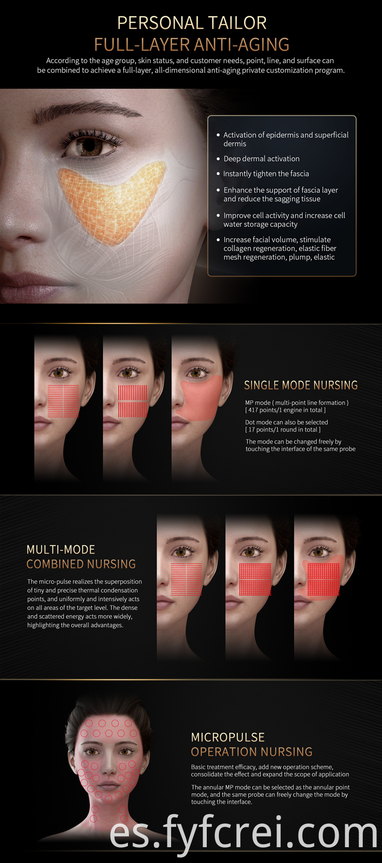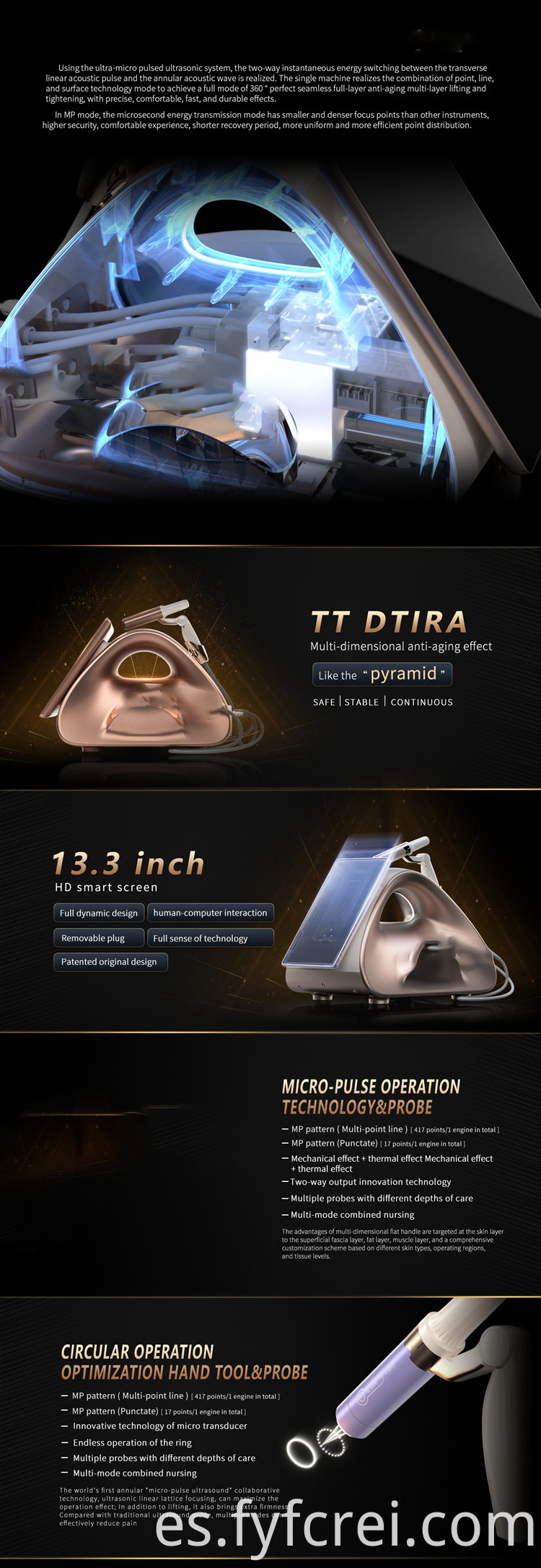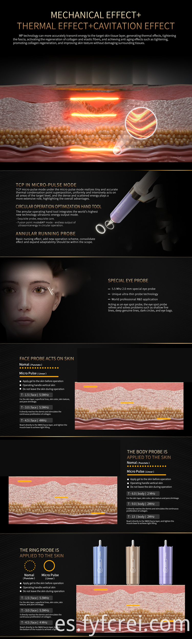 Un instrumento que no causa heridas. El principio utiliza un sistema de ultrasonido pulsado ultramicro para lograr una combinación de tecnología de punto, línea y superficie para lograr un modo completo 360: levantamiento y ajuste multicapa antienvejecimiento de capa completa sin costuras, efecto preciso, cómodo, rápido y duradero. A partir de ahora, podrá atender a sus clientes en su propia casa o en un salón de belleza. A continuación, le brindará a usted o a sus clientes una hermosa experiencia de enfermería.