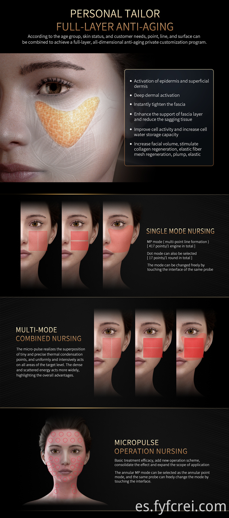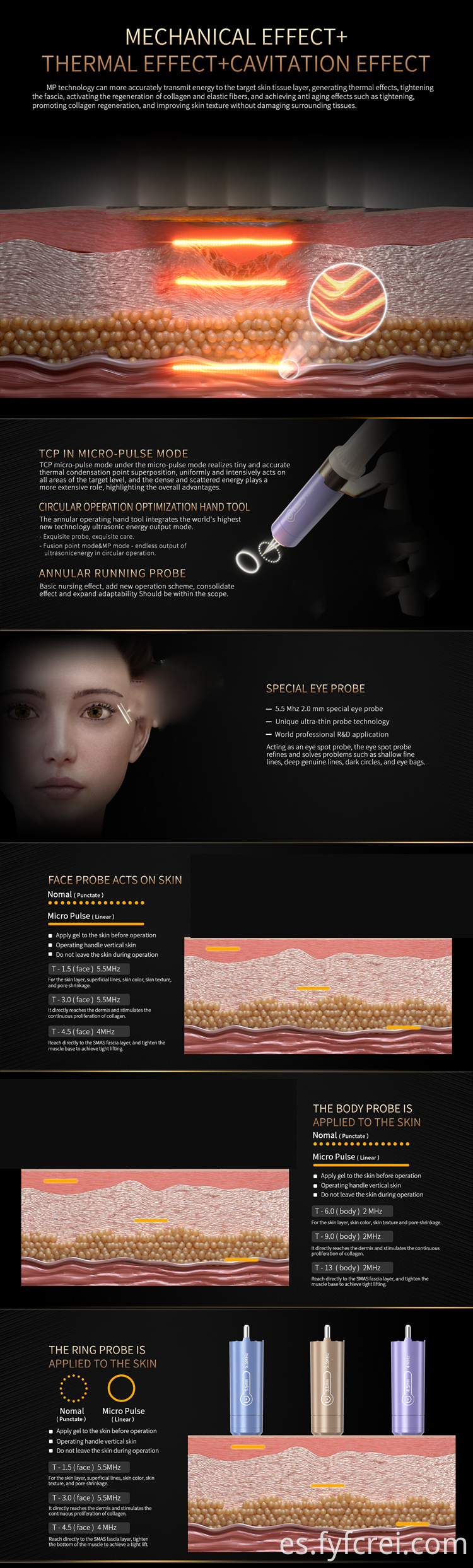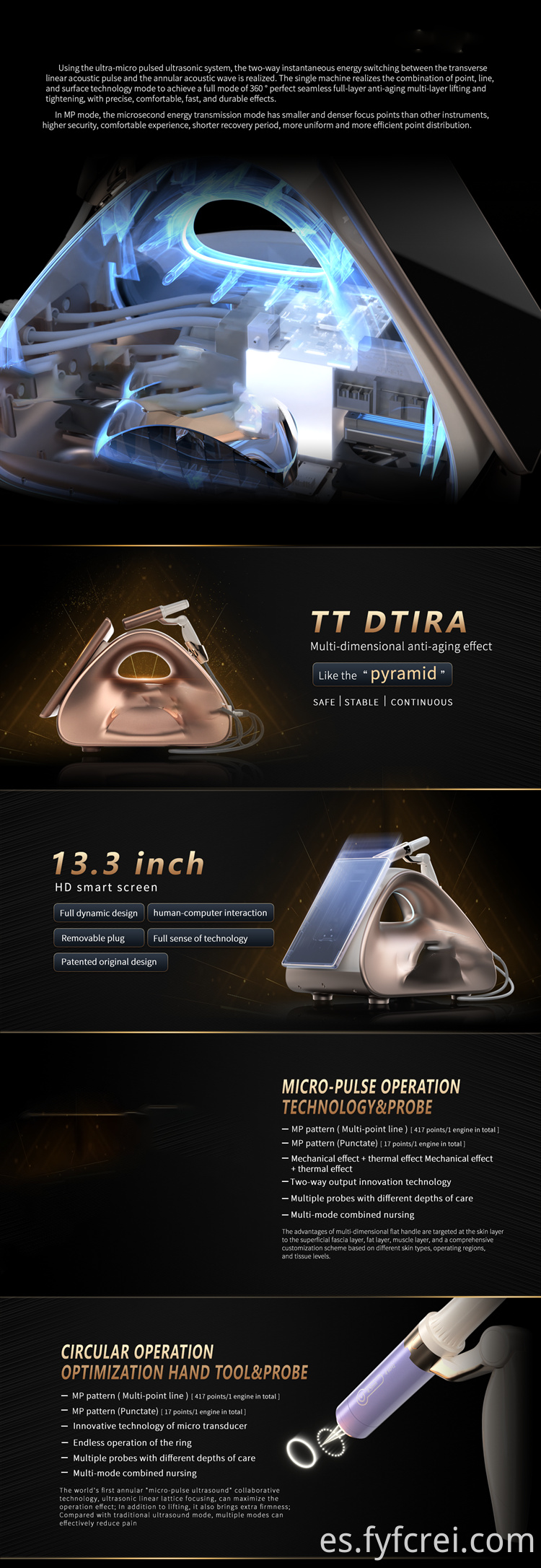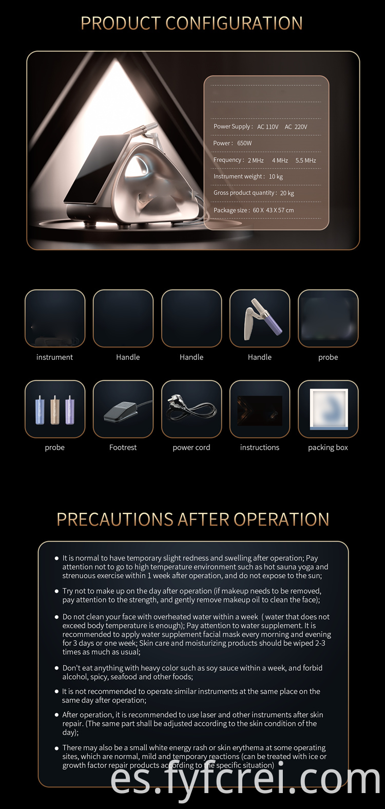 Un instrumento que no causa heridas. El principio utiliza un sistema de ultrasonido pulsado ultramicro para lograr una combinación de tecnología de punto, línea y superficie para lograr un modo completo 360: levantamiento y ajuste multicapa antienvejecimiento de capa completa sin costuras, efecto preciso, cómodo, rápido y duradero. A partir de ahora, podrá atender a sus clientes en su propia casa o en un salón de belleza. A continuación, le brindará a usted o a sus clientes una hermosa experiencia de enfermería.