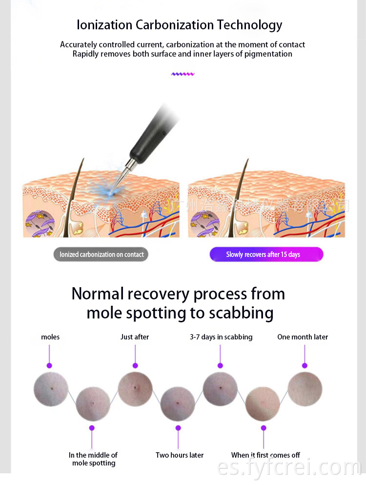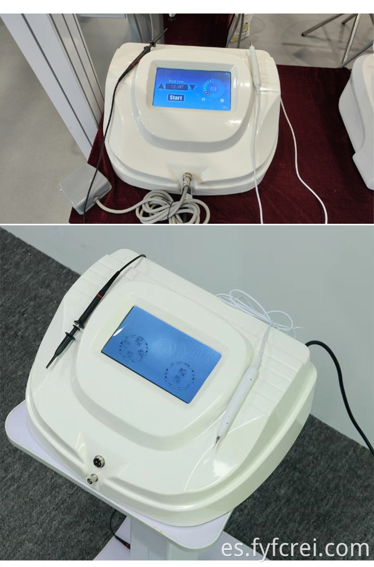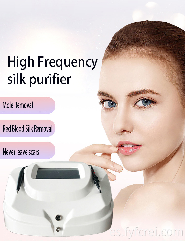 Utilizando micropuntos de alta frecuencia, oscilación electromagnética de frecuencia ultra alta de 300 MHz, con seda suave única (más delgada que el cabello), la hemoglobina rota en 1/1000 segundos, liberará la conducción de energía a la superficie de la piel, eliminará los capilares enfermos y la hemoglobina de los vasos sanguíneos se romperá en pequeñas moléculas absorbidas por el propio tejido de la piel, para lograr la erradicación permanente de la sangre roja.